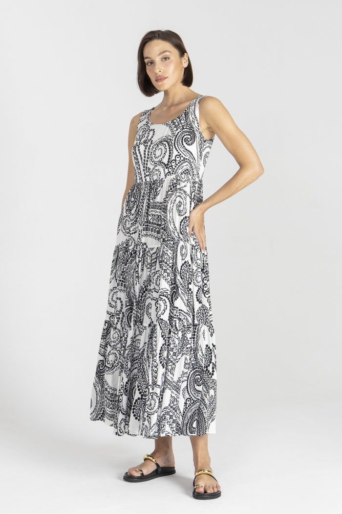 Zen Flow to długa, zwiewna sukienka, która zachwyca obszernymi, poziomo marszczonymi falbanami, nadającymi jej wyjątkowy charakter i swobodny, relaksacyjny styl. Jej ponadczasowy design sprawia, że jest to model zarówno na wakacyjne wyjazdy, jak i na gorące letnie dni, gdy komfort i przewiewność są najważniejsze. Dzięki superlekkiej tkaninie, mimo dużej ilości materiału, sukienka pozostaje niezwykle komfortowa i pełna lekkości, co podkreśla jej luźny, nonszalancki urok. Klasyczna paleta bieli i czerni z nowoczesnym, orientalnym nadrukiem dodaje jej wyrafinowania i artystycznej ekspresji, sprawiając, że model ten świetnie wpisuje się w trendy letniej elegancji.