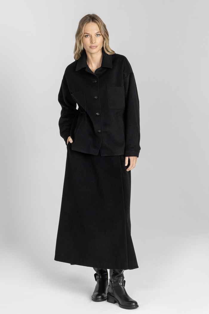 Nowatorska interpretacja klasycznej, długiej spódnicy – model inspirowany światowymi trendami, w których projektanci odważnie sięgają po tkaniny płaszczowe w roli zimowych spódnic. Ten wyjątkowy fason został uszyty z miękkiego, wysokogatunkowego flauszu z domieszką szlachetnego kaszmiru, dzięki czemu zachowuje elegancję, lekkość i przyjemny, aksamitny dotyk.