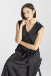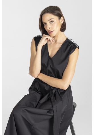 Model ma prostą konstrukcję bez rękawów, uzupełnioną paskiem do przewiązania w talii, co pozwala podkreślić sylwetkę lub nosić sukienkę w bardziej luźnej wersji. Najważniejszym detalem sukienki jest ornament z kontrastowej taśmy naszyty na ramionach, który nadaje całości nienachalnej oryginalności i sprawia, że klasyczna forma staje się nietuzinkowa i nowoczesna. Czarna wersja kolorystyczna dodaje sukience elegancji, uniwersalności i łatwości w komponowaniu stylizacji – zarówno na codzienne wyjścia, jak i na bardziej uporządkowane letnie okazje. To model dla kobiet, które cenią wygodę, funkcjonalność i subtelne, wyrafinowane detale.