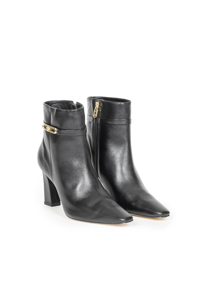 Stylowe i eleganckie botki wykonane z wysokogatunkowej, gładkiej skóry naturalnej to propozycja łącząca luksusowy wygląd z funkcjonalnym komfortem noszenia. Projekt wyróżnia się piękną linią cholewki, która została lekko poszerzona, by subtelnie otulać łydkę i zapewniać swobodę ruchu. Delikatna klamerka po boku stanowi gustowny akcent, dodający całości wyrafinowanego charakteru.