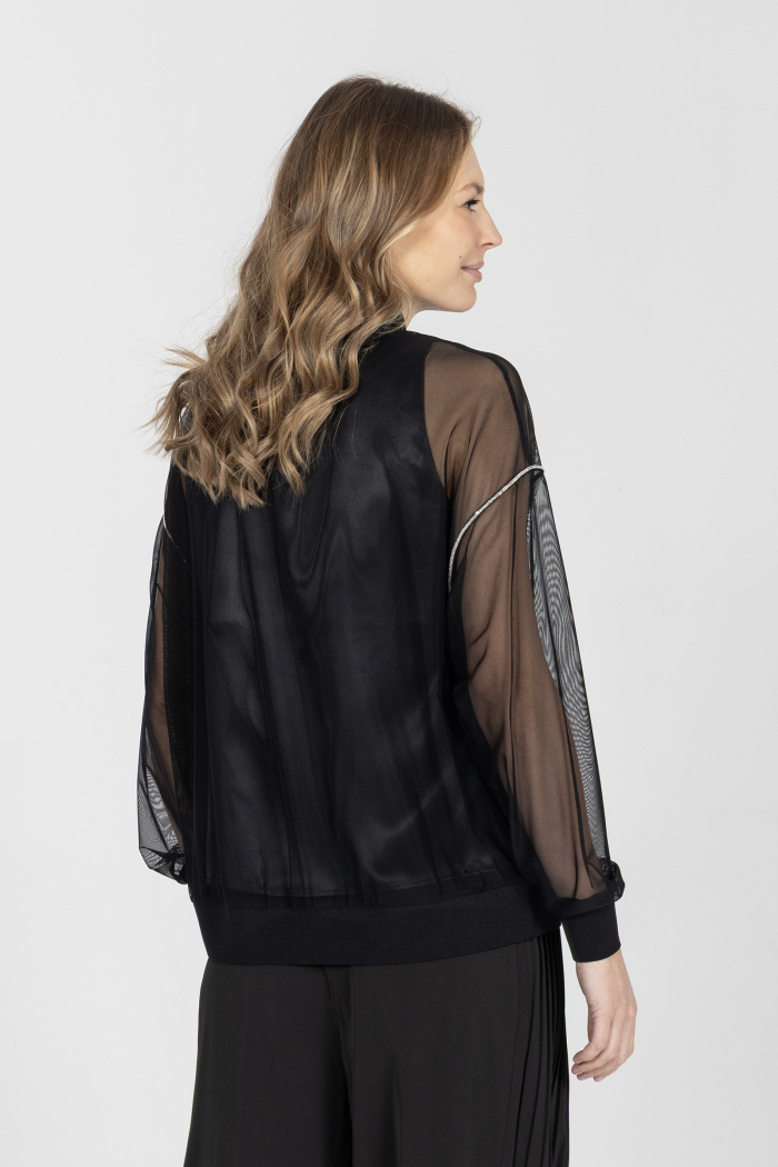 Efektowna czarna bomberka z tiulu to nowoczesna, ultra lekka interpretacja klasycznego okrycia wierzchniego. Model zachwyca subtelną konstrukcją oraz biżuteryjnymi detalami – wykończenie suwaka i szwów rękawów zostało obszyte drobniutkimi, metalowymi koralikami, przypominającymi makowe ziarenka. Ten kunsztowny detal nadaje całości wyjątkowego charakteru i czyni bomberkę elegancką alternatywą dla tradycyjnych żakietów czy kurtek.