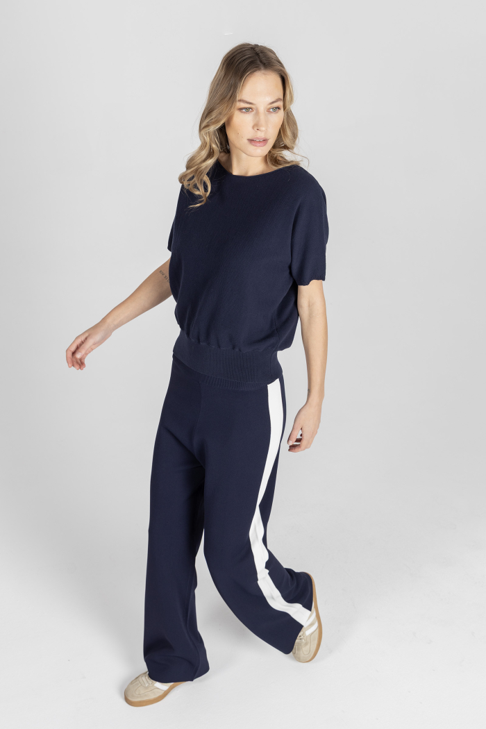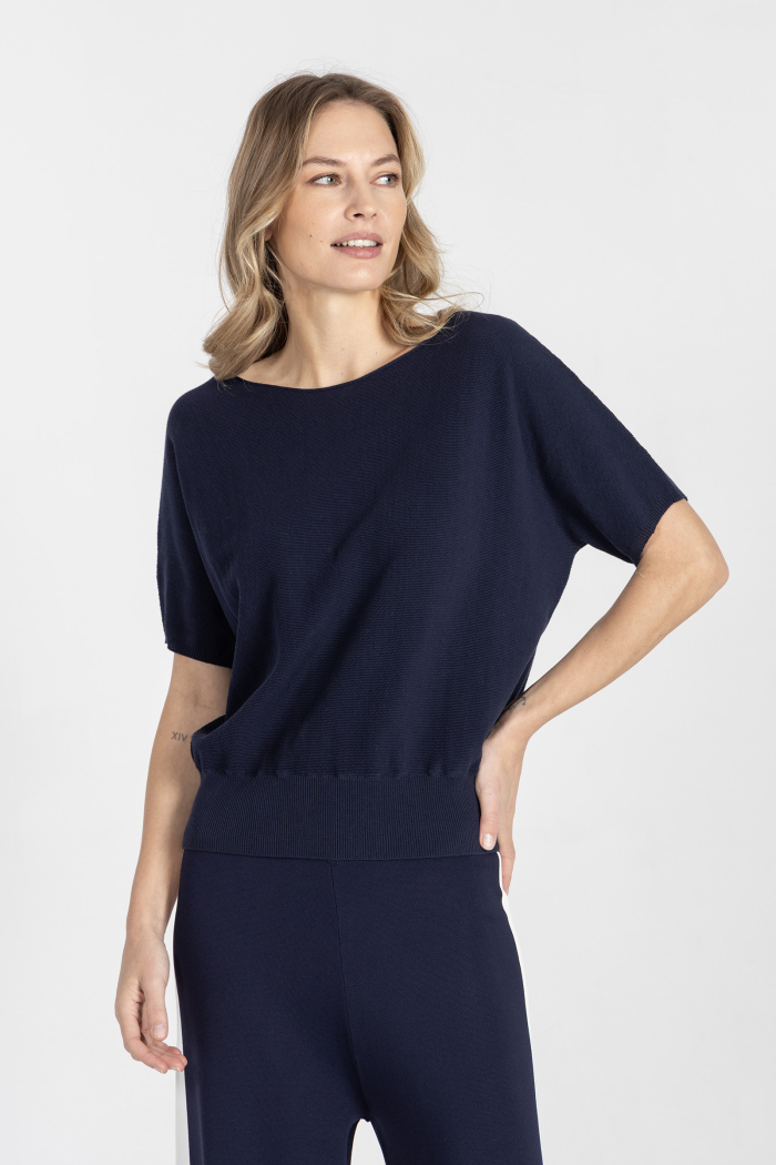 Ten granatowy sweter z krótkim, kimonowym rękawkiem to nowoczesna, lekka propozycja, która łączy swobodę formy z dopracowanymi, minimalistycznymi detalami. Charakterystyczny dekolt typu łódka został wykończony bezściągaczowo, co nadaje mu naturalnej surowości i czystej, designerskiej linii. To subtelny zabieg, który od razu wyróżnia model na tle klasycznych dzianin.