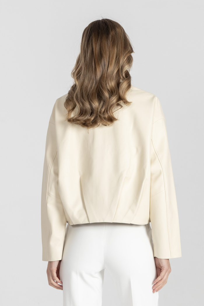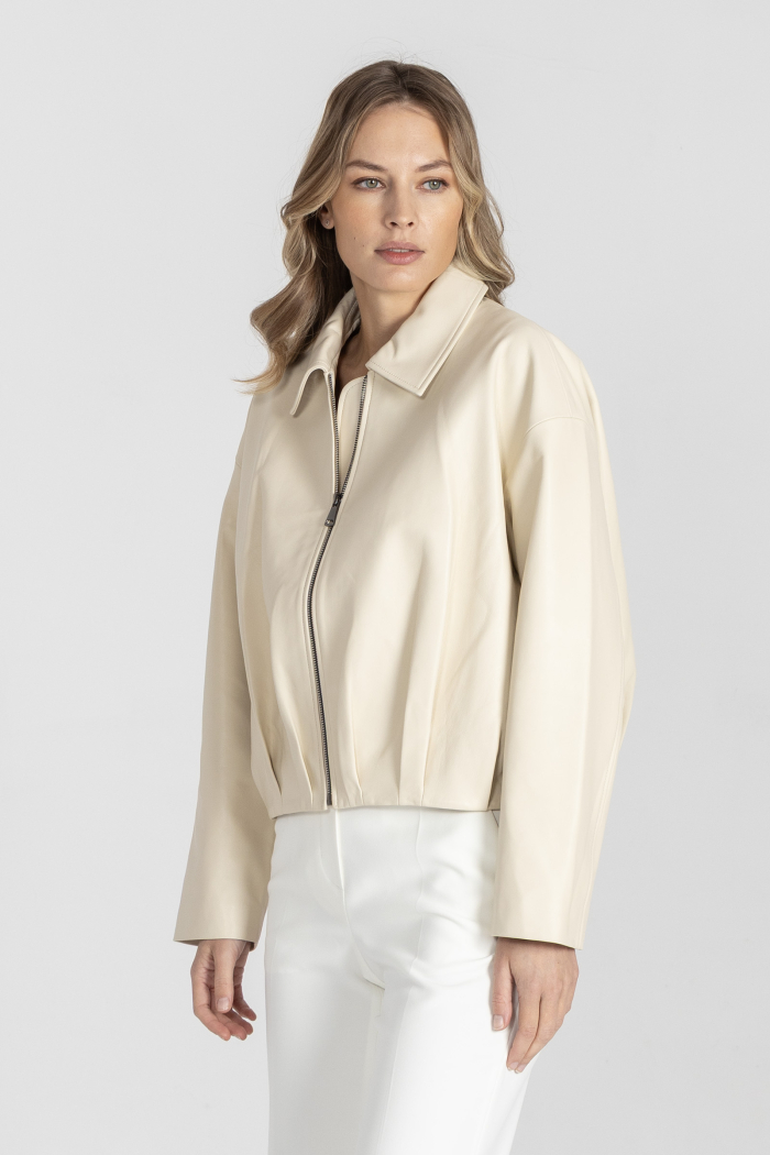 Ta kurtka z cienkiej, miękkiej skóry naturalnej w kolorze ecru to nowoczesna i niezwykle elegancka propozycja na sezon przejściowy. Krótki fason inspirowany formą bluzy nadaje jej lekko sportowego charakteru, który został zrównoważony szlachetnością materiału i dopracowanymi detalami. Zapięcie na metalowy suwak typu ekler podkreśla nowoczesną linię modelu i dodaje mu wyrazistości.