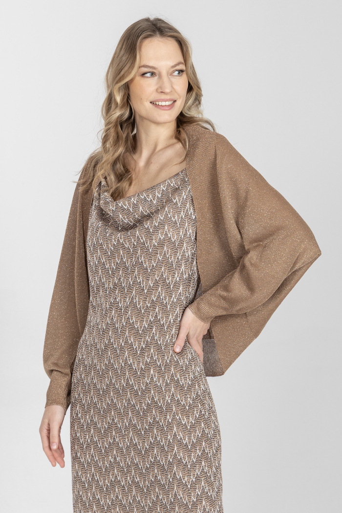 Ten krótki kardigan w odcieniu złota to elegancka i niezwykle praktyczna dzianina, która doskonale uzupełnia stylizacje o bardziej formalnym charakterze. Model zaprojektowano bez zapięcia, dzięki czemu miękko układa się na sylwetce i może pełnić rolę lekkiego okrycia, szczególnie w stylizacjach wymagających subtelnego przykrycia ramion.