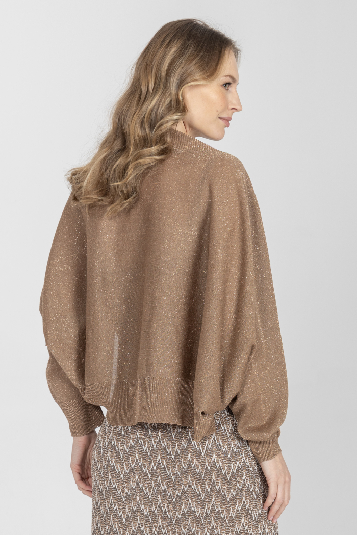 Przędza została wykonana z mieszanki wiskozy i poliamidu, co nadaje dzianinie wyjątkową jakość wizualną. Materiał jest miękki, lekki i subtelnie połyskuje – powierzchnia delikatnie odbija światło i skrzy, co nadaje modelowi luksusowy charakter.
