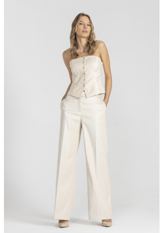 Ten wyjątkowy gorset to połączenie elegancji i współczesnego szyku. Wykonany z efektownej tkaniny, będącej mieszanką bawełny z cieniutkimi włóknami poliamidu i poliestru, zachwyca subtelnym, delikatnie skrzącym się wykończeniem w odcieniach różu i kremu. Fason inspirowany klasyczną kamizelką sprawia, że gorset doskonale wpisuje się w nowoczesne trendy. Może być noszony jako główny element stylizacji lub w zestawie ze spodniami i żakietem, tworząc elegancki i szykowny komplet na wyjątkowe okazje.