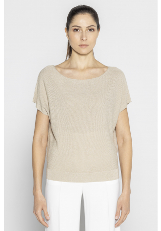 Ta mała, klasyczna bluzeczka z krótkim rękawkiem to wyjątkowa propozycja dla kobiet ceniących prostotę z nutą luksusu. Uszyta z miękkiej wiskozowej przędzy z dodatkiem lureksu, zachwyca subtelnym, złotym blaskiem, który pięknie ożywia beżową bazę tkaniny.